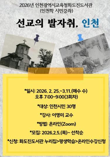 • [비즈인천] 인천광역시교육청화도진도서관은 ‘선교의 발자취, 인천’이라는 주제로 2026년 인천학 시민강좌를 운영한다.