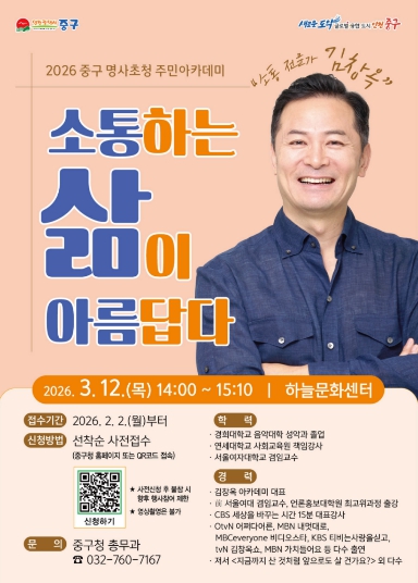 [비즈인천] 인천시 중구는 오는 3월 12일 오후 2시 하늘문화센터에서 소통 전문가 김창옥과 함께하는 올해 첫 번째 ‘중구 명사 초청 주민아카데미’를 개최한다고 밝혔다.