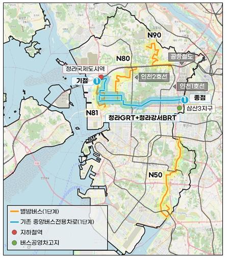 - 2단계(확대도입): 인천대로, 경인로 등 신규 중앙버스전용차로 구축 구간으로 노선을 확대하여 광역교통 주요 거점 간 연결성을 강화