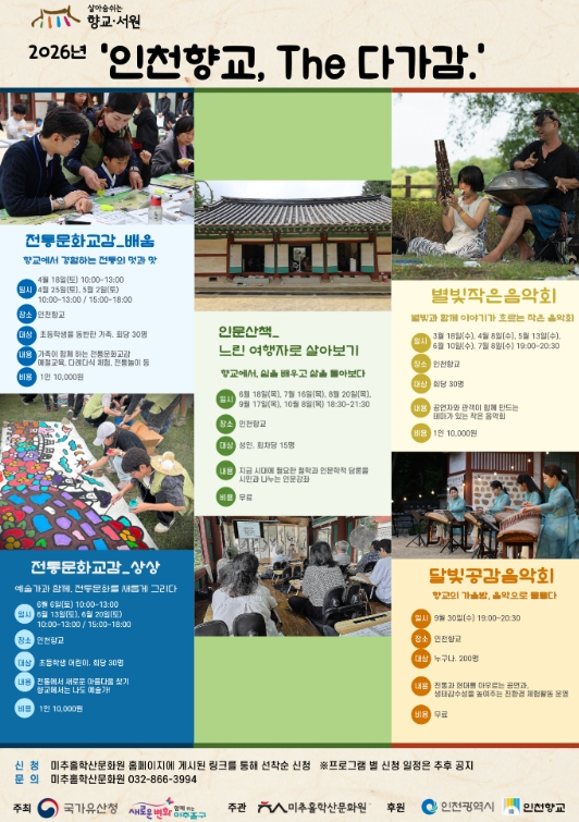 인천향교에서 진행되는 ‘인천향교 The다가감’은 전통 교육기관의 가치를 현대적으로 재해석한 참여형 프로그램이다. 향교라는 공간을 시민 누구나 쉽게 찾을 수 있는 ‘열린 문화공간’으로 확장하는 데 중점을 뒀다. 나아가 전통이 일상 속 실천과 사유로 이어지도록 기획했다.